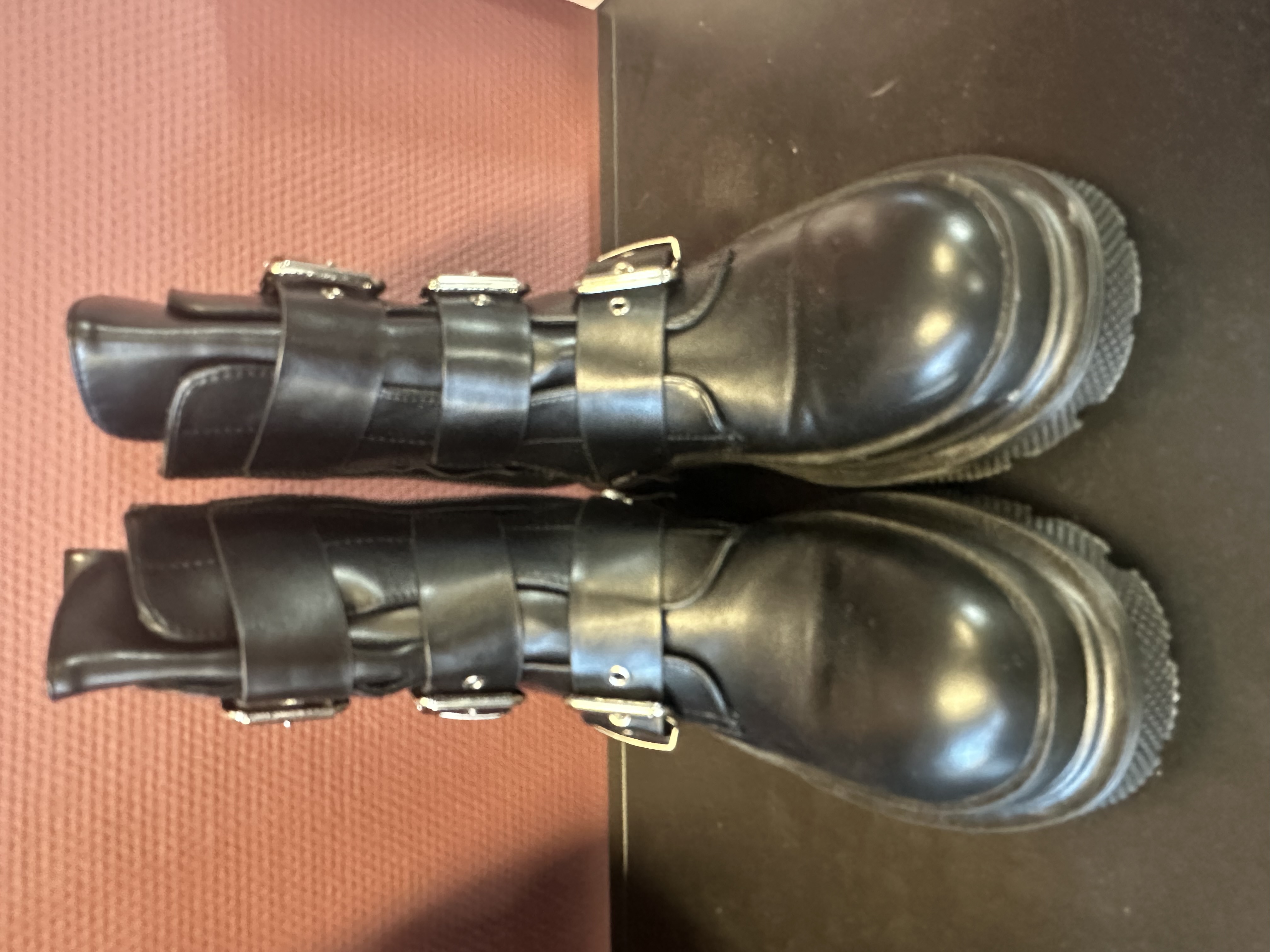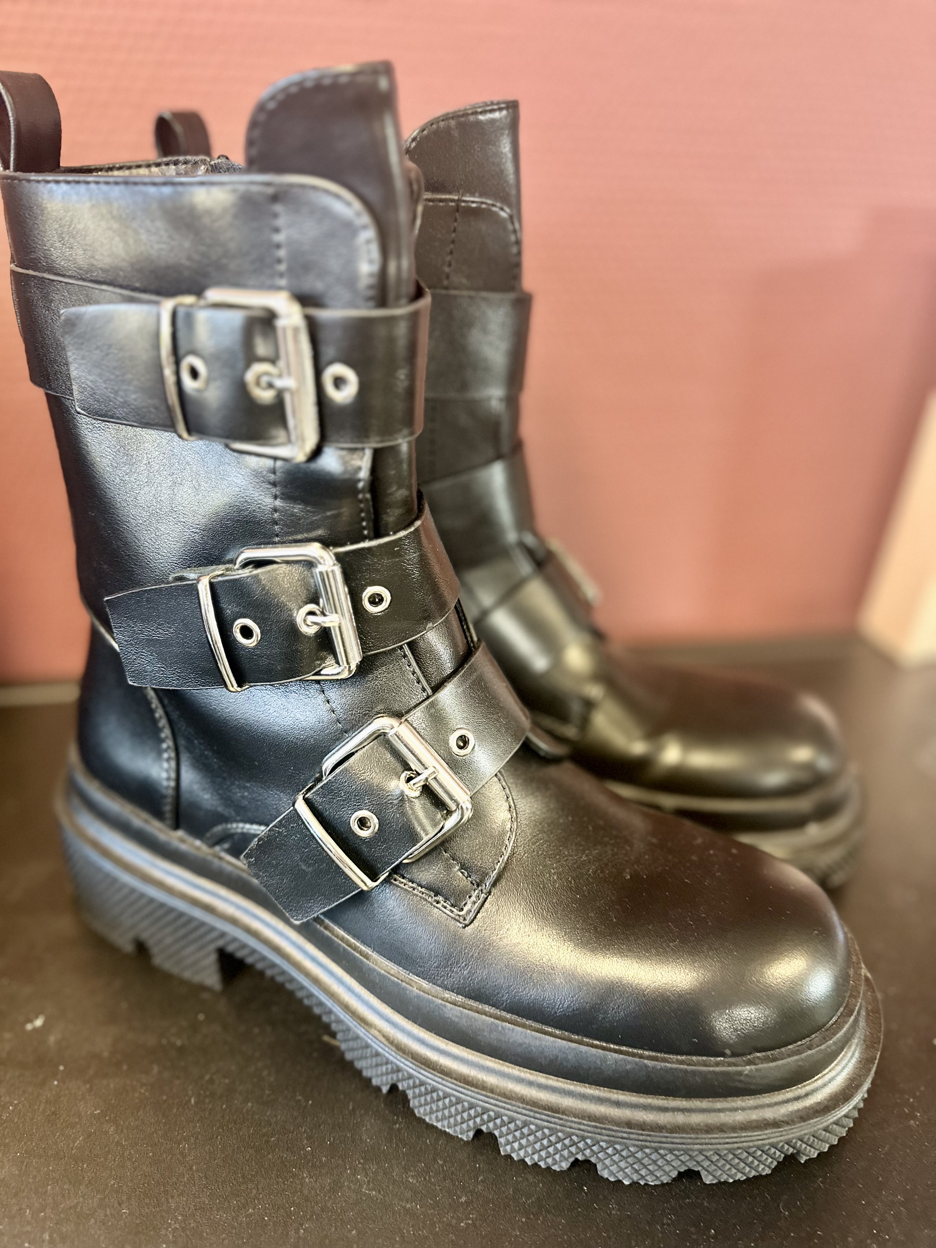Shiny Bello støvlen i sort har et råt og cool udtryk med tydelig inspiration fra klassiske bikerstøvler. Den går op til midt på læggen og er designet med tre spænder på ydersiden, som tilføjer karakter og kant. Lynlåsen sidder praktisk på indersiden, så støvlen er nem at tage af og på. Overfladen har en let glans – ikke helt mat, men heller ikke skinnende – hvilket giver støvlen et stilrent, men robust look. En alsidig model, der løfter ethvert outfit med et edgy twist.