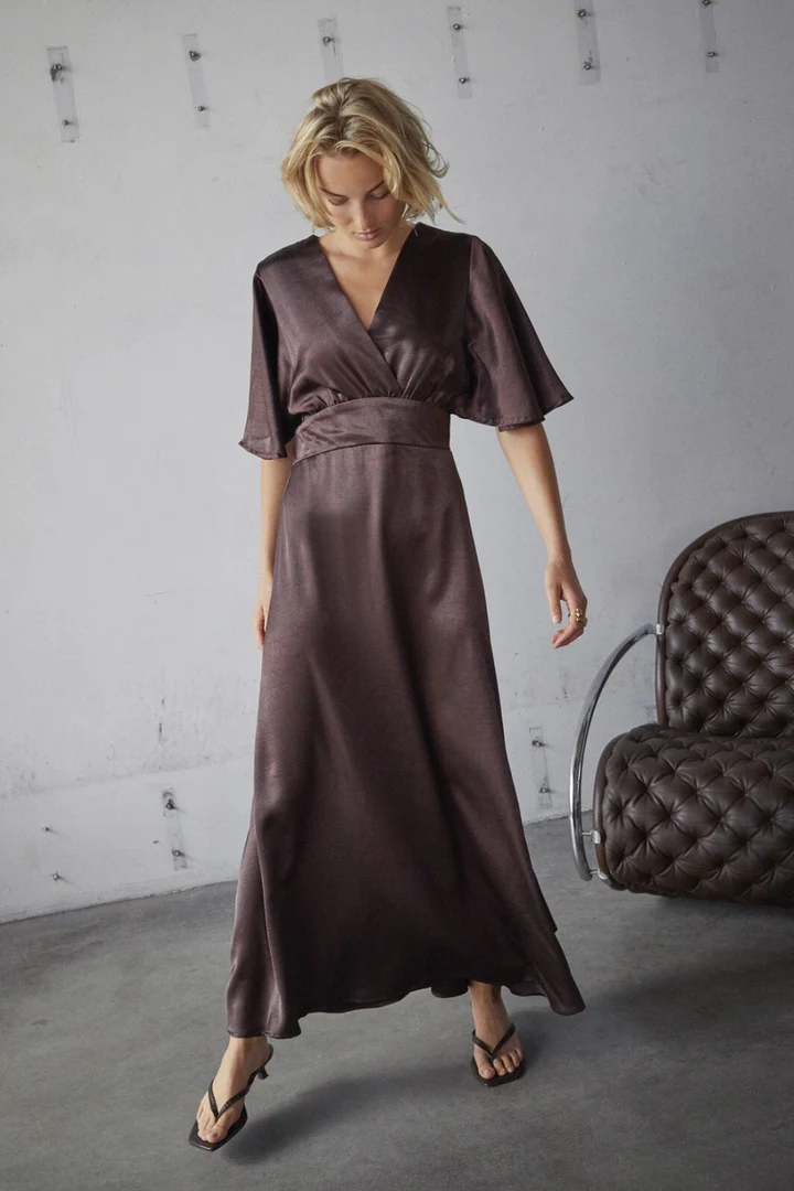 Sisters Point Gisela Dress er en elegant kjole med en smuk v‑udskæring og korte, løst faldende ærmer, der giver et luftigt og sofistikeret look. Kjolen er figursyet i taljen og har en smockbagstyldel, der sikrer en flatterende pasform uden at stramme. Den lange længde og det flydende materiale giver et stilfuldt og feminine udtryk, som passer både til festlige lejligheder og særlige hverdage.