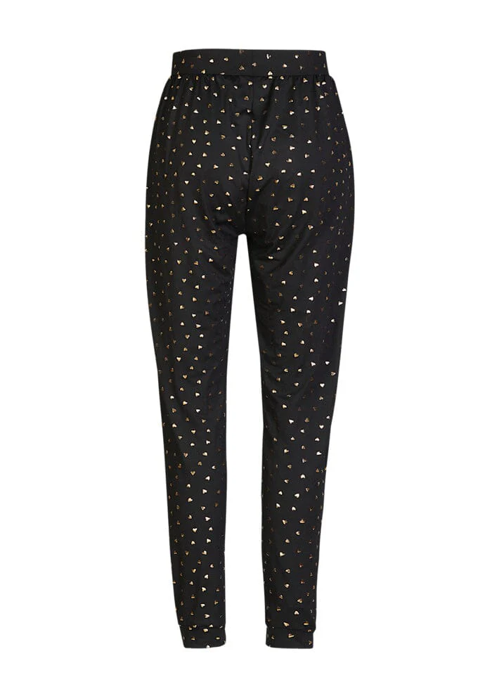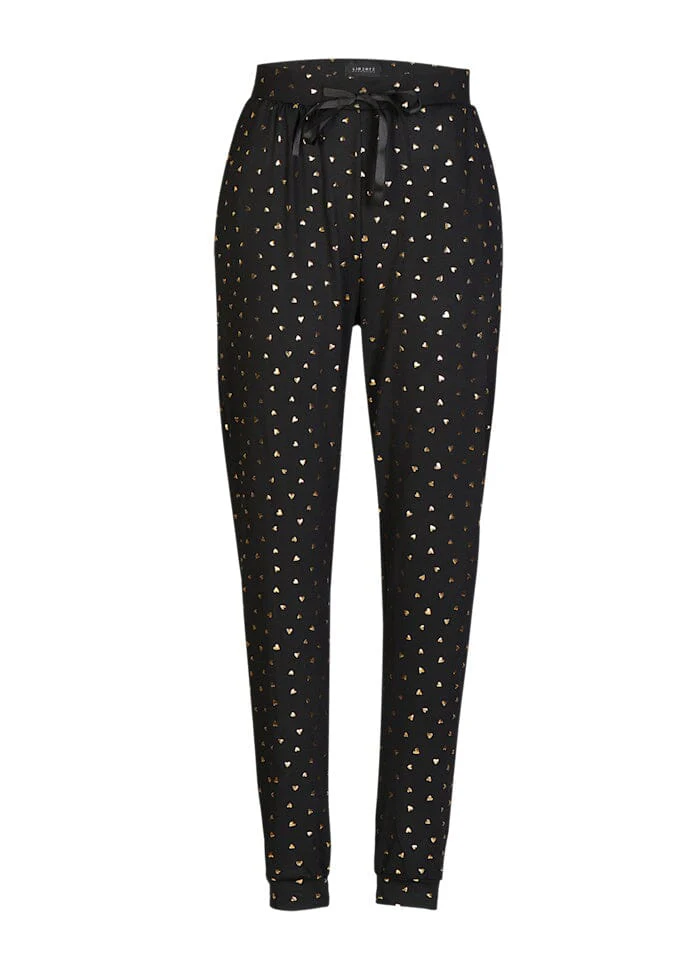 Liberte Alma Pants i Black Gold Heart er et par bløde og komfortable bukser med et fint guld-hjerteprint. De har elastisk talje med bindebånd, som giver en fleksibel og justerbar pasform, og den smalle silhuet gør dem velegnede både til hverdag og pænere brug. Brug dem sammen med en enkel top for et afslappet look, eller kombiner dem med den matchende overdel for et fuldendt sæt.