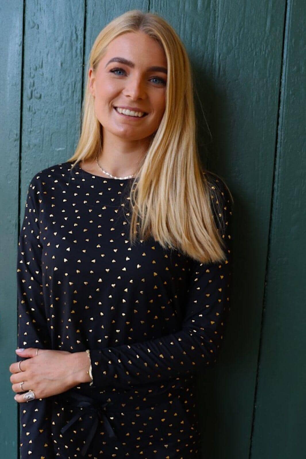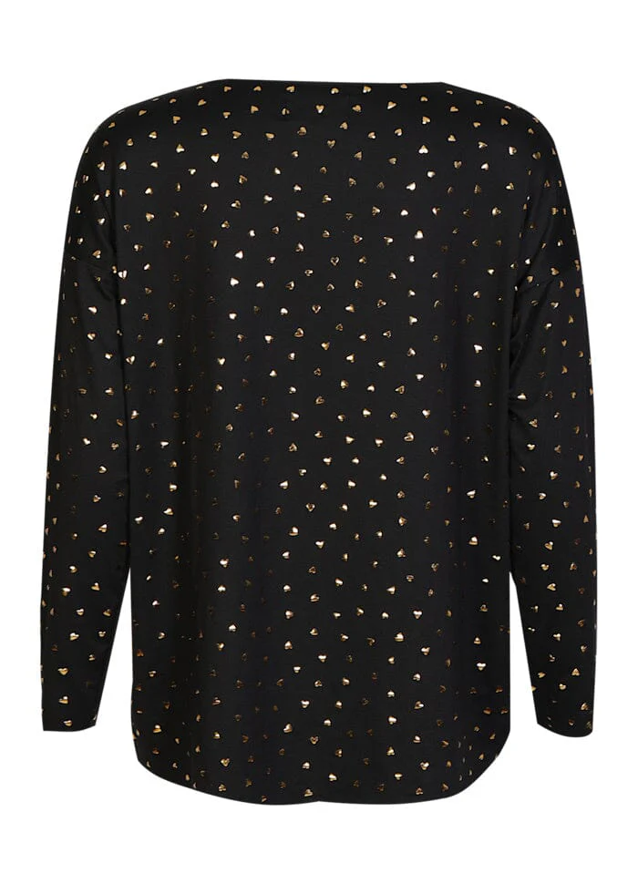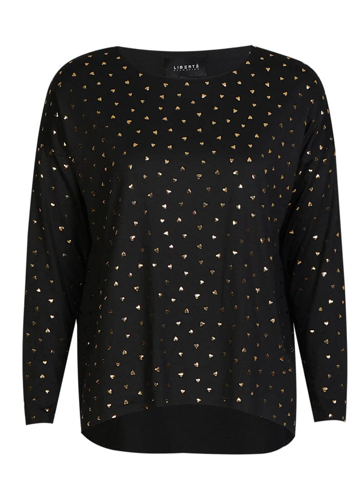 Liberte Alma Top i Black Gold Heart, style 9504, er en let og behagelig top med det fine guld-hjerteprint, der giver et feminint og stilrent udtryk. Toppen har en flatterende pasform med stræk, som gør den komfortabel til både hverdag og festlige anledninger. Den fungerer perfekt alene eller sammen med de matchende Alma Pants for et fuldendt sæt.