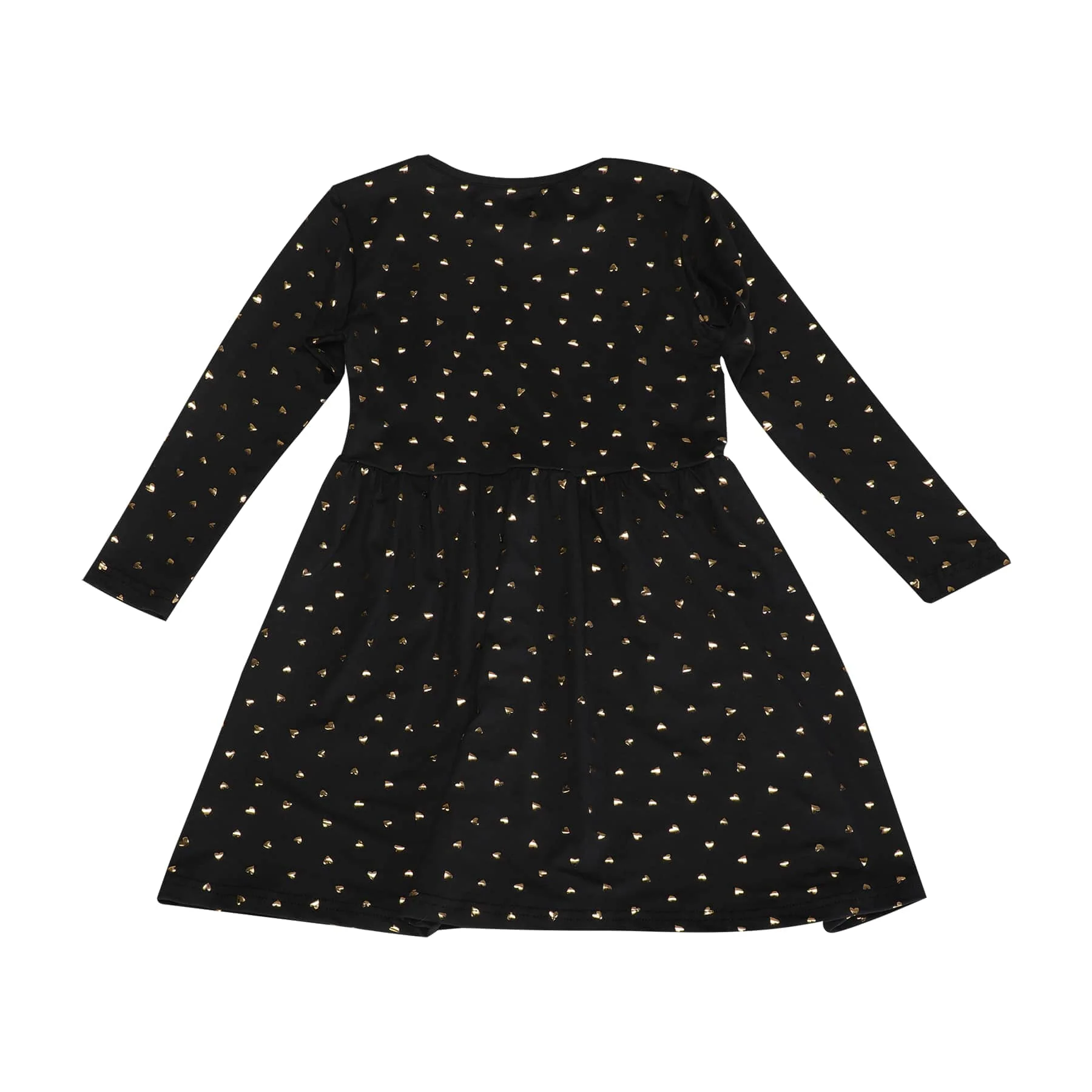 Liberte Ami Alma Babydoll Dress i sort med gyldne hjerter er en sød og let kjole til børn, som falder blødt og giver et komfortabelt og legende udtryk. Det fine hjertemønster gør den ekstra charmerende, og den afslappede pasform giver masser af bevægelsesfrihed til både leg og hverdag. I samme serie findes også matchende pants og T-shirt, så der kan skabes et hyggeligt og sammenhængende look.