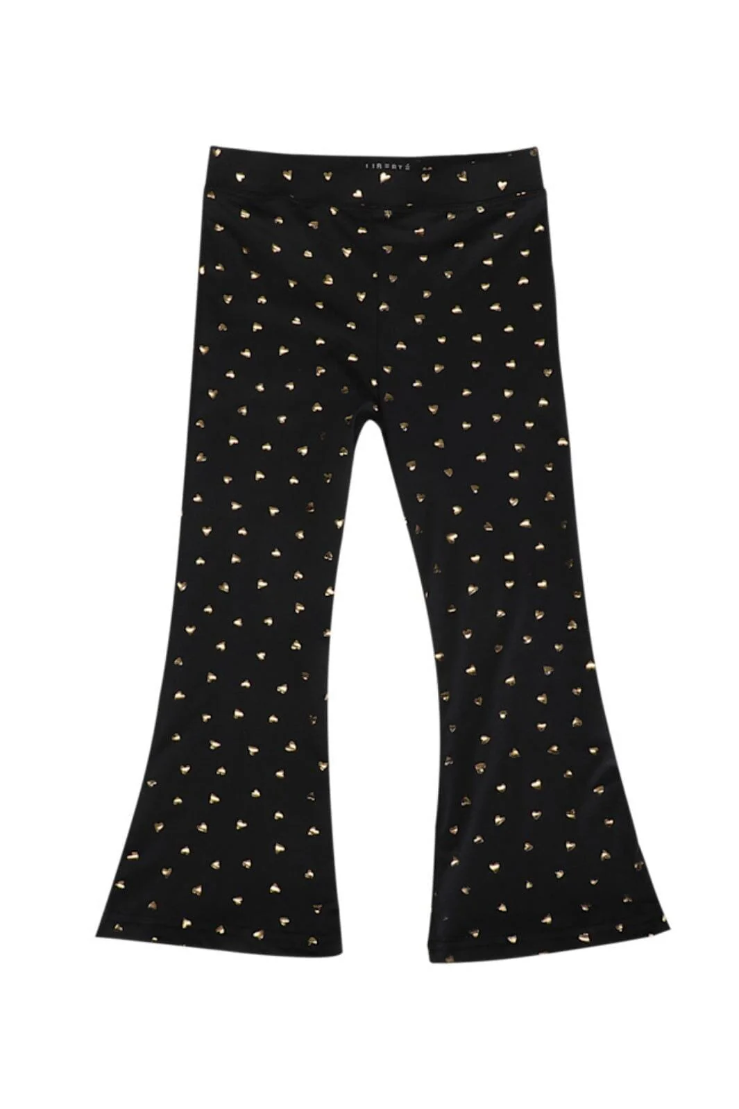 De fine flair bukser i sort med gyldne hjerter er skabt i et blødt og strækbart materiale, der giver optimal komfort til aktive børn. Det legende hjertemønster tilfører et sødt og moderne udtryk, mens det lette svaj i benene giver bukserne en stilfuld form, som børn nemt kan bevæge sig i. De kan med fordel matches med seriens T-shirt for et samlet og hyggeligt look, der passer til både hverdagsbrug og afslappede stunder.
