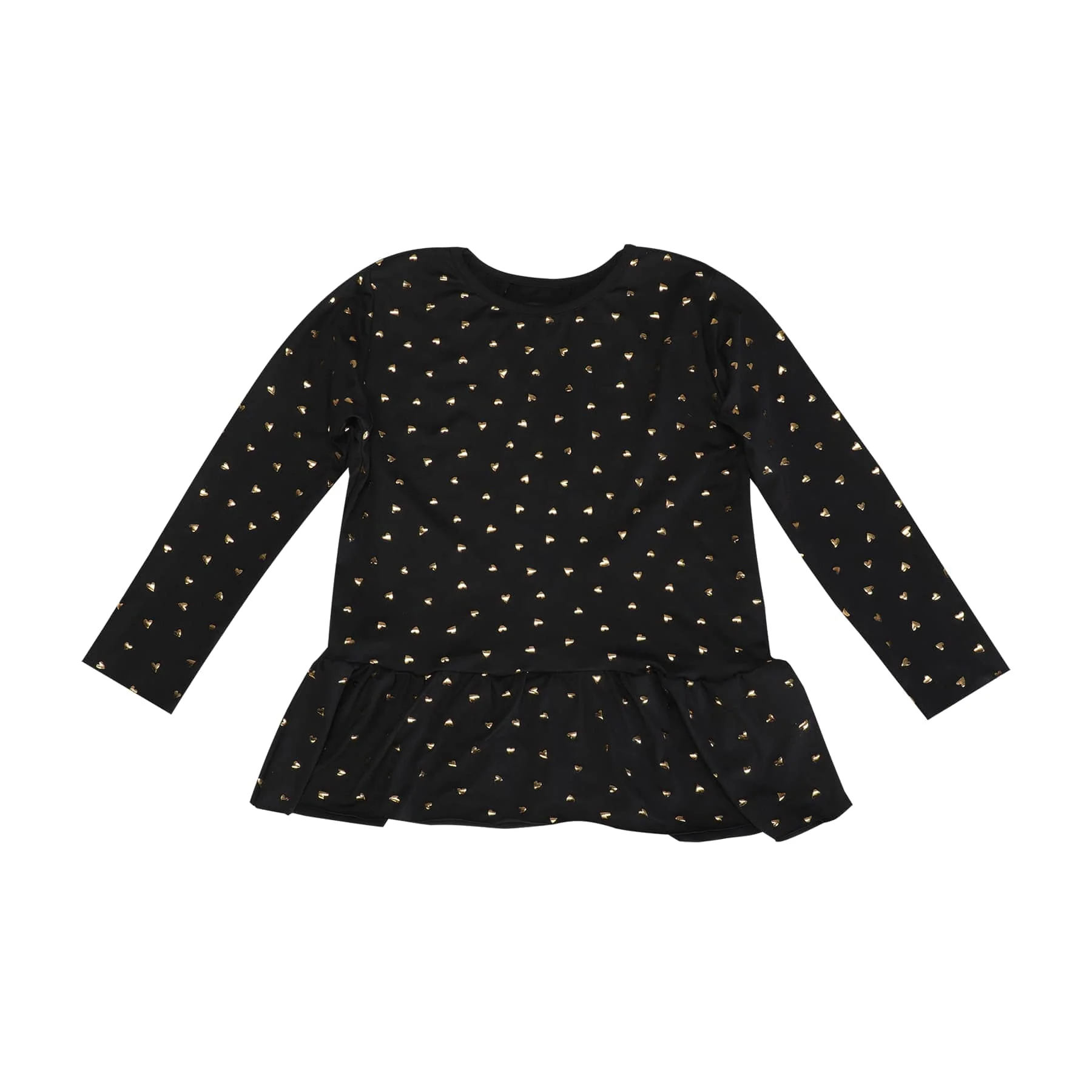 Liberte Ami Alma Frill Tshirt Black Gold Heart er en blød og behagelig langærmet T-shirt til børn, designet i sort med små gyldne hjerter for et sødt og moderne udtryk. Den lette og fleksible kvalitet gør den komfortabel til både leg og hverdag, og den brede, faldende underdel giver et fint, afslappet look. T-shirten kan med fordel matches med de tilhørende pants for et charmerende og sammenhængende sæt.