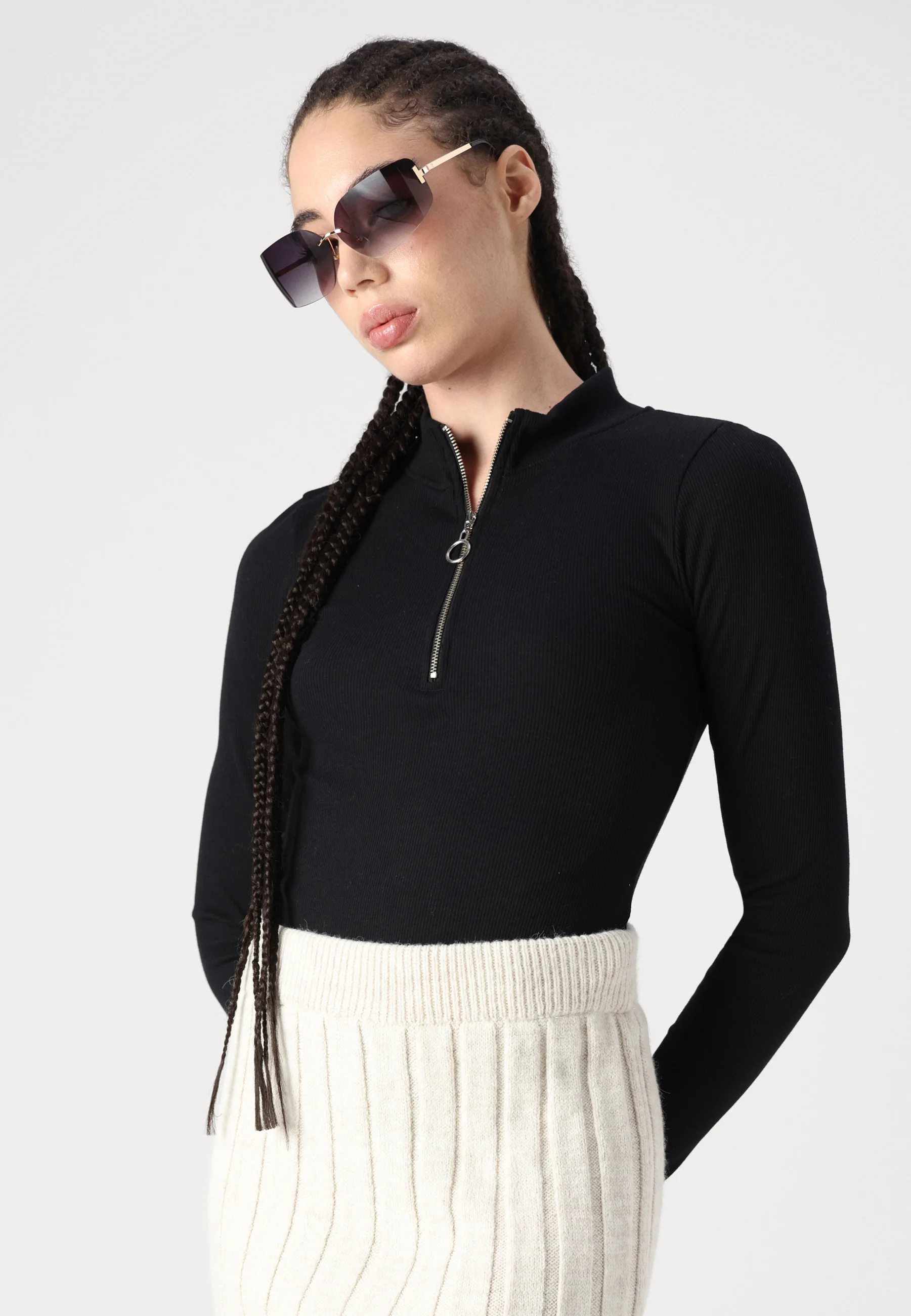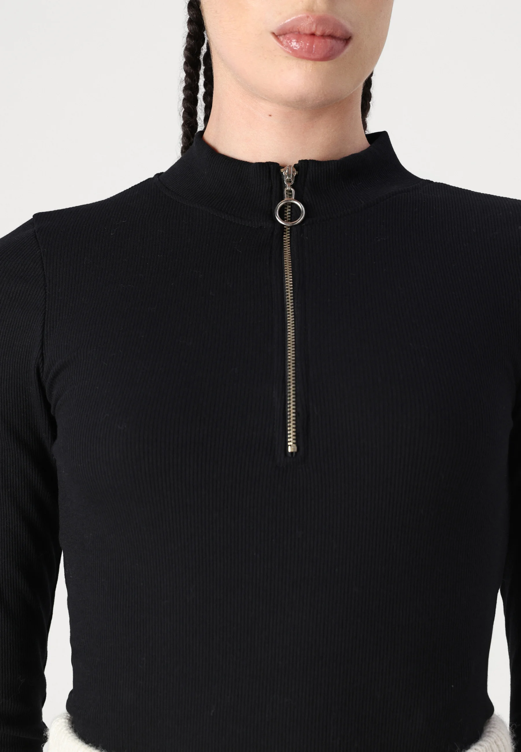 Noisy May Toni L/S High Neck Body Zipper i sort er en stilren og alsidig body med et moderne udtryk. Den har lange ærmer og en høj hals, som giver et elegant look, mens lynlåsen foran tilføjer et råt og trendy twist. Den tætsiddende pasform fremhæver silhuetten og gør bodyen nem at style både til hverdag og aftenbrug. Den kan bruges alene med jeans eller nederdel, men fungerer også perfekt under en blazer eller jakke for et mere sofistikeret outfit.