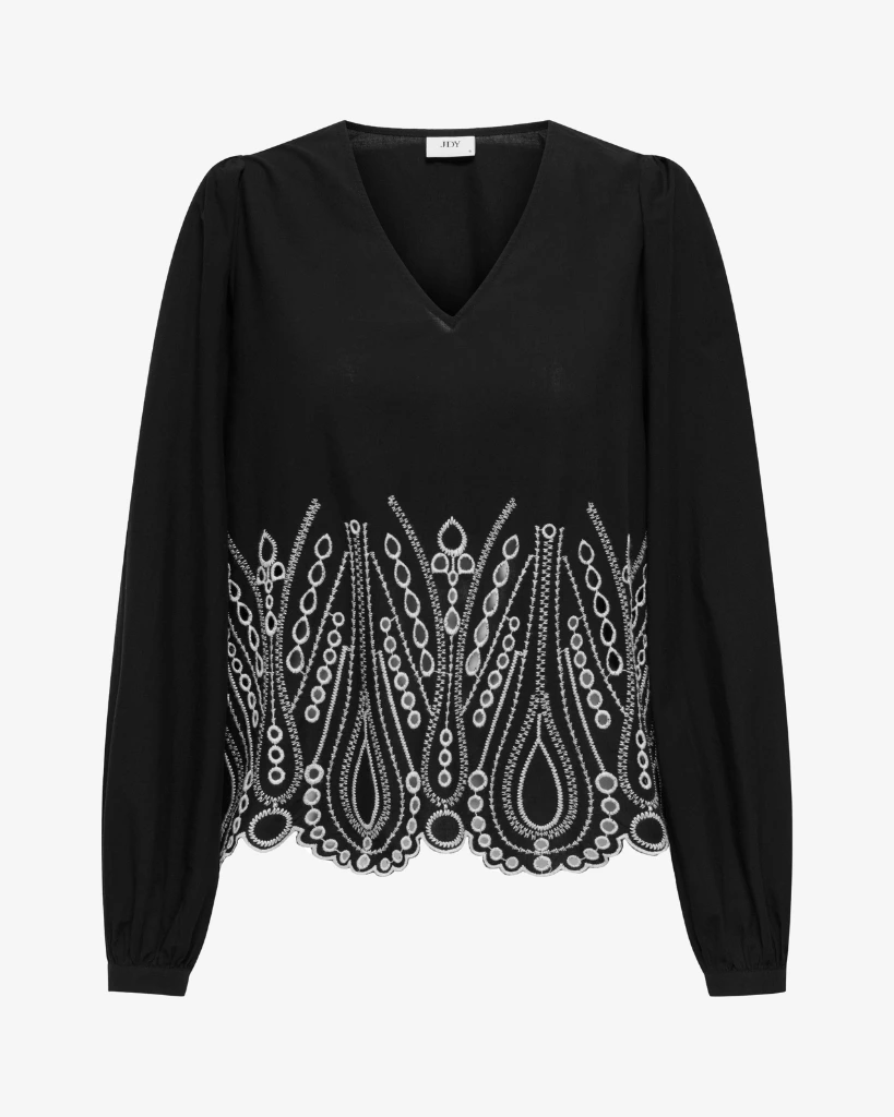 JDY Molly Anglaise Top Black/White er en flot og yndig bluse med fine broderidetaljer og en bølget kant. Den bløde bomuld og det løse fit gør den behagelig at have på, mens V-halsudskæringen og de lange ballonærmer med elastik ved håndleddene skaber et elegant og feminint look.