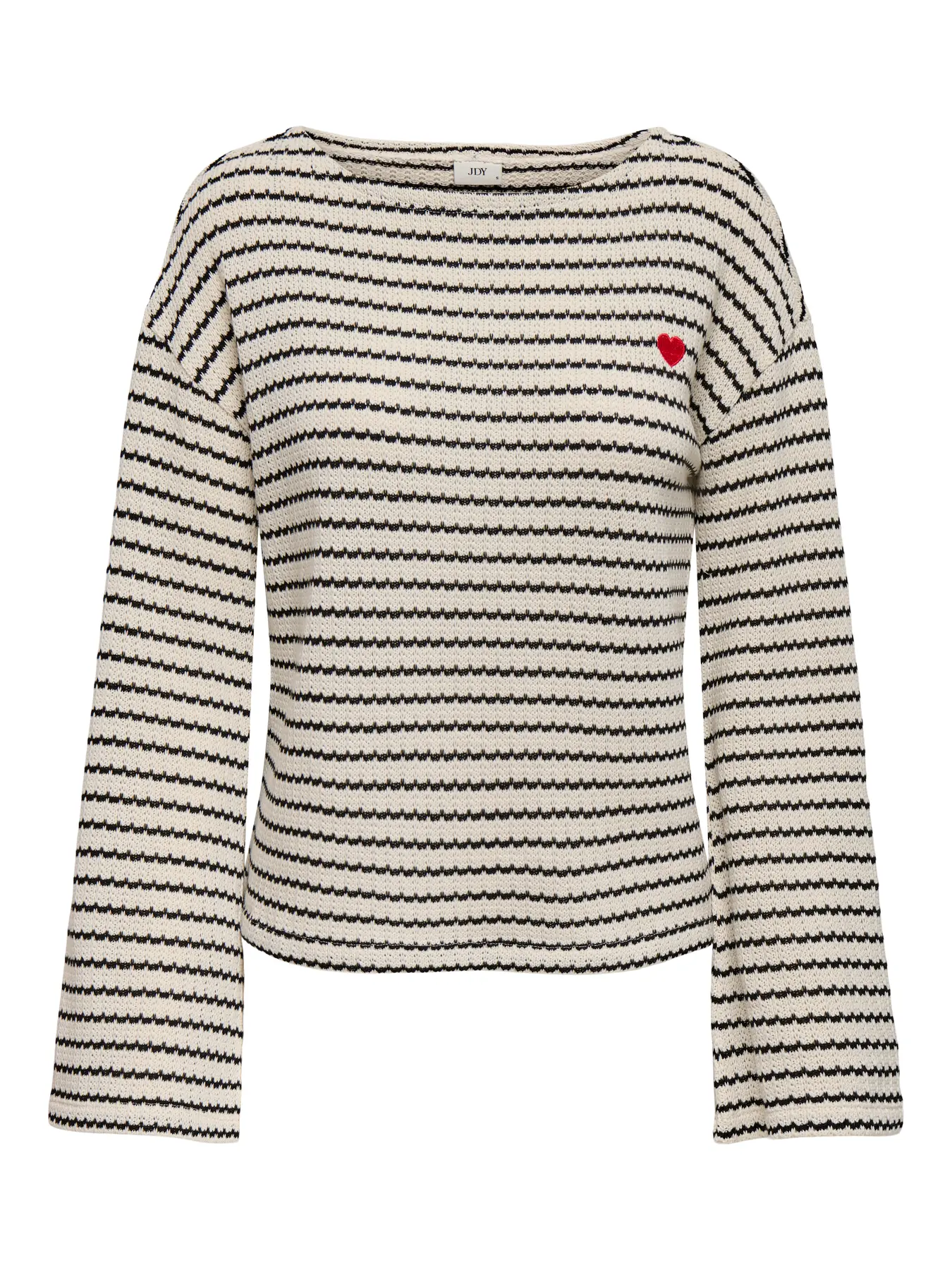 JDY Thea Boatneck Top i Birch Black Iris er en blød og behagelig strik med et klassisk bådudskæring. Den hvide farve og sorte striber giver et tidløst look, mens det lille røde hjerte på venstre bryst tilføjer et sødt, personligt twist. Perfekt til både hverdag og afslappede outfits.