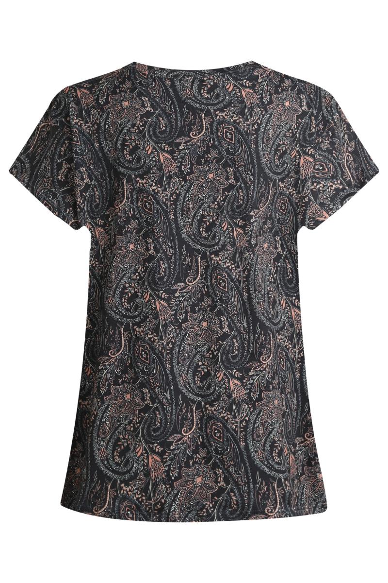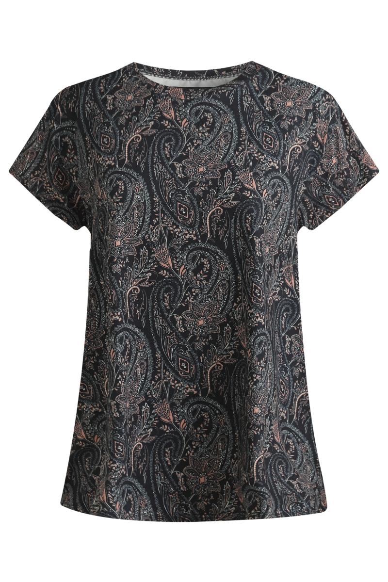 Liberté Essentiel Alma T-shirt er en stilren og feminin t-shirt med det karakteristiske paisley-print i farven Night Sky. Den korte ærmelængde og den komfortable pasform giver et afslappet, men velklædt udtryk, mens det bløde, strækbare materiale gør den behagelig at have på hele dagen. T-shirten kan styles med de matchende bukser i samme print for et harmonisk look eller kombineres med jeans eller nederdel til en nem og moderne hverdagsstil.