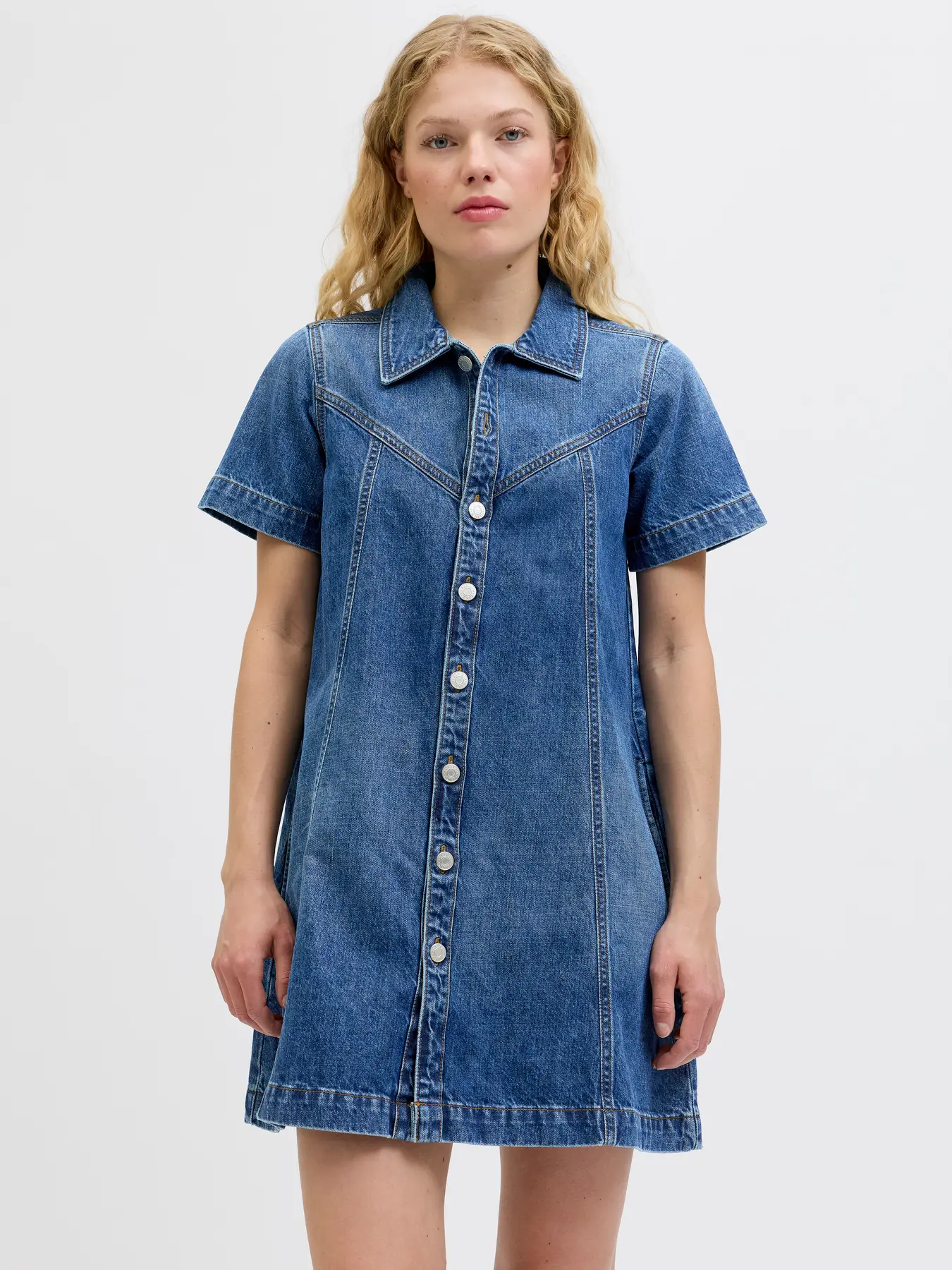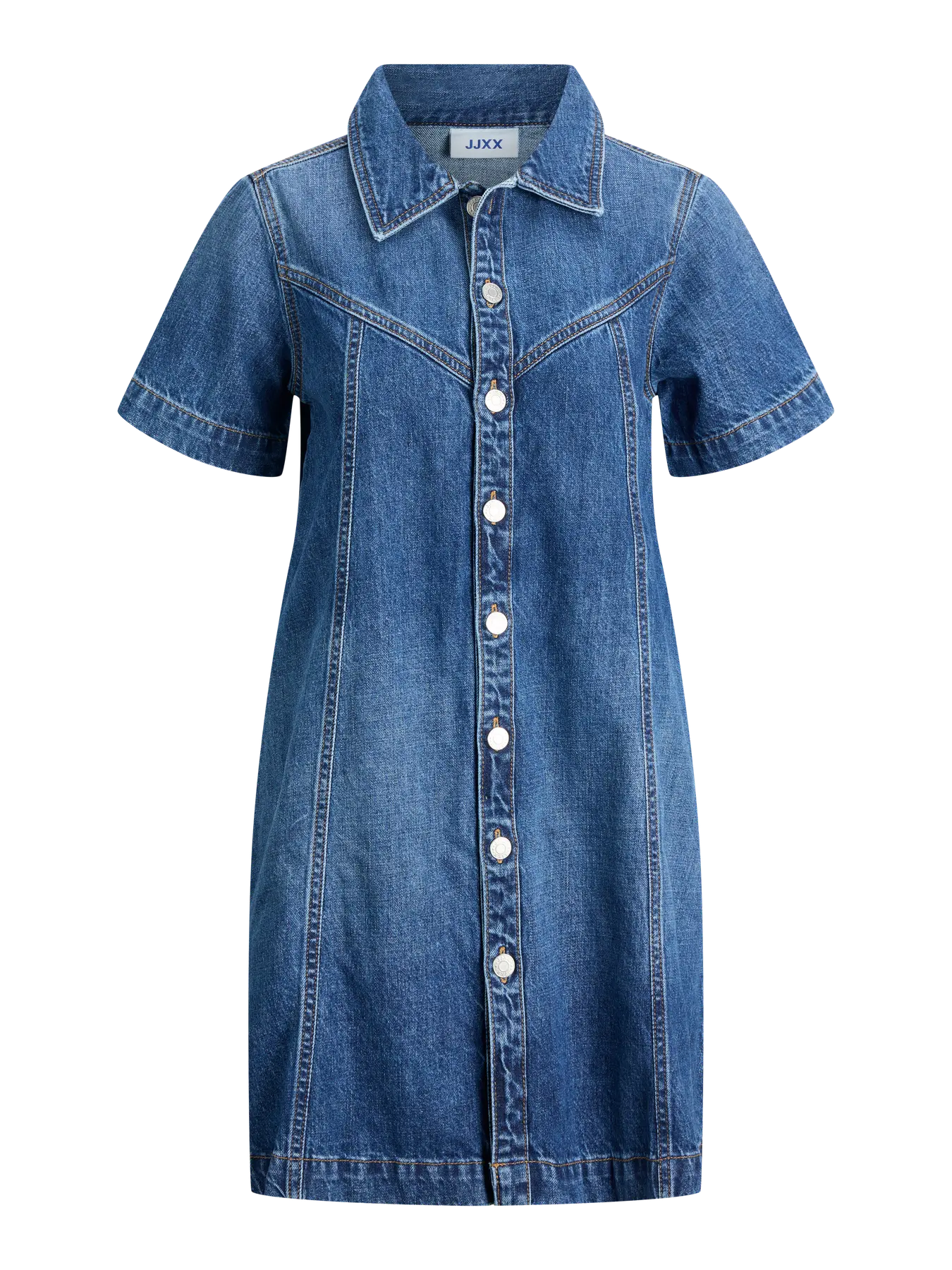 JJXX Amara A Shape Dress Denim er en moderne denimkjole med et flatterende A-formet snit. Det enkle design giver et afslappet og stilrent udtryk, som gør kjolen nem at style til både hverdag og mere afslappede anledninger. Et tidløst valg, der passer perfekt ind i en alsidig garderobe.