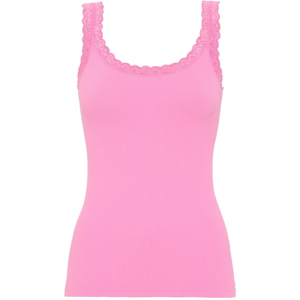 Tim & Simonsen Frida Rib Top i Macaron er en ribbet top i en sart lyserød nuance med dekorativ blondekant, som tilfører et feminint og elegant udtryk. Den tætsiddende pasform gør den komfortabel at have på og let at style både alene og sammen med andre styles.