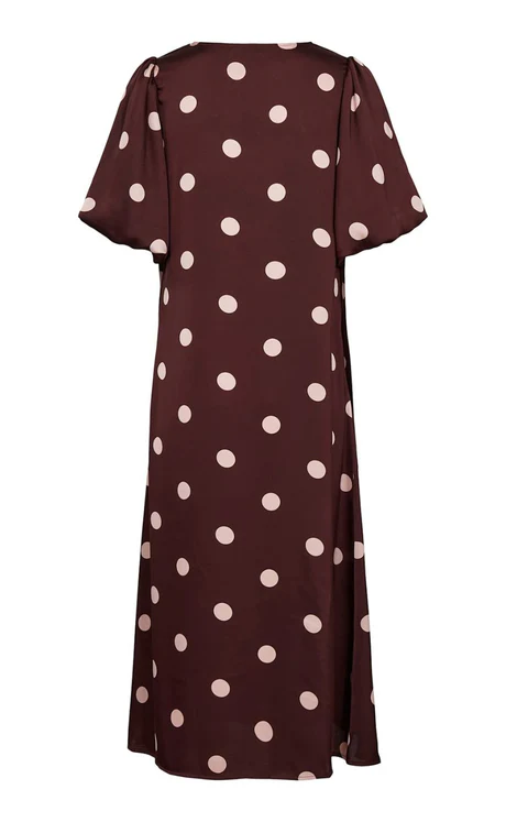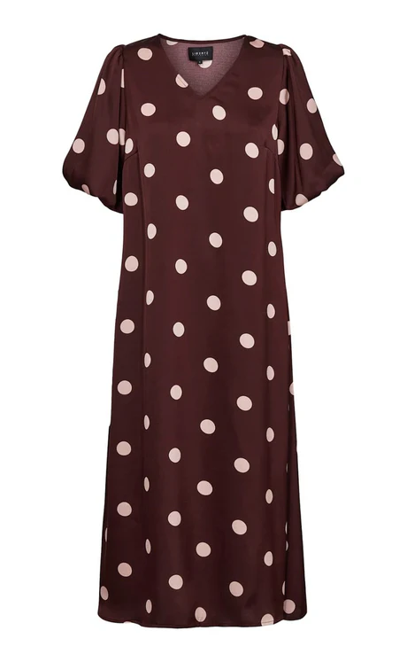 Liberte Essentiel Dotti Dress Plum Rose Big Dot er en elegant og feminin kjole fra Liberté, designet i en smuk, dyb brun plum rose-nuance med iøjnefaldende lyse prikker. Den flatterende V-udskæring kombineret med korte ærmer med let fylde giver et stilrent og moderne udtryk. Den lange, løstsiddende pasform falder blødt og naturligt om kroppen og sikrer en behagelig komfort hele dagen. Kjolen er alsidig og kan styles både casual til hverdagen og mere elegant til festlige anledninger – alt efter valg af sko og accessories.