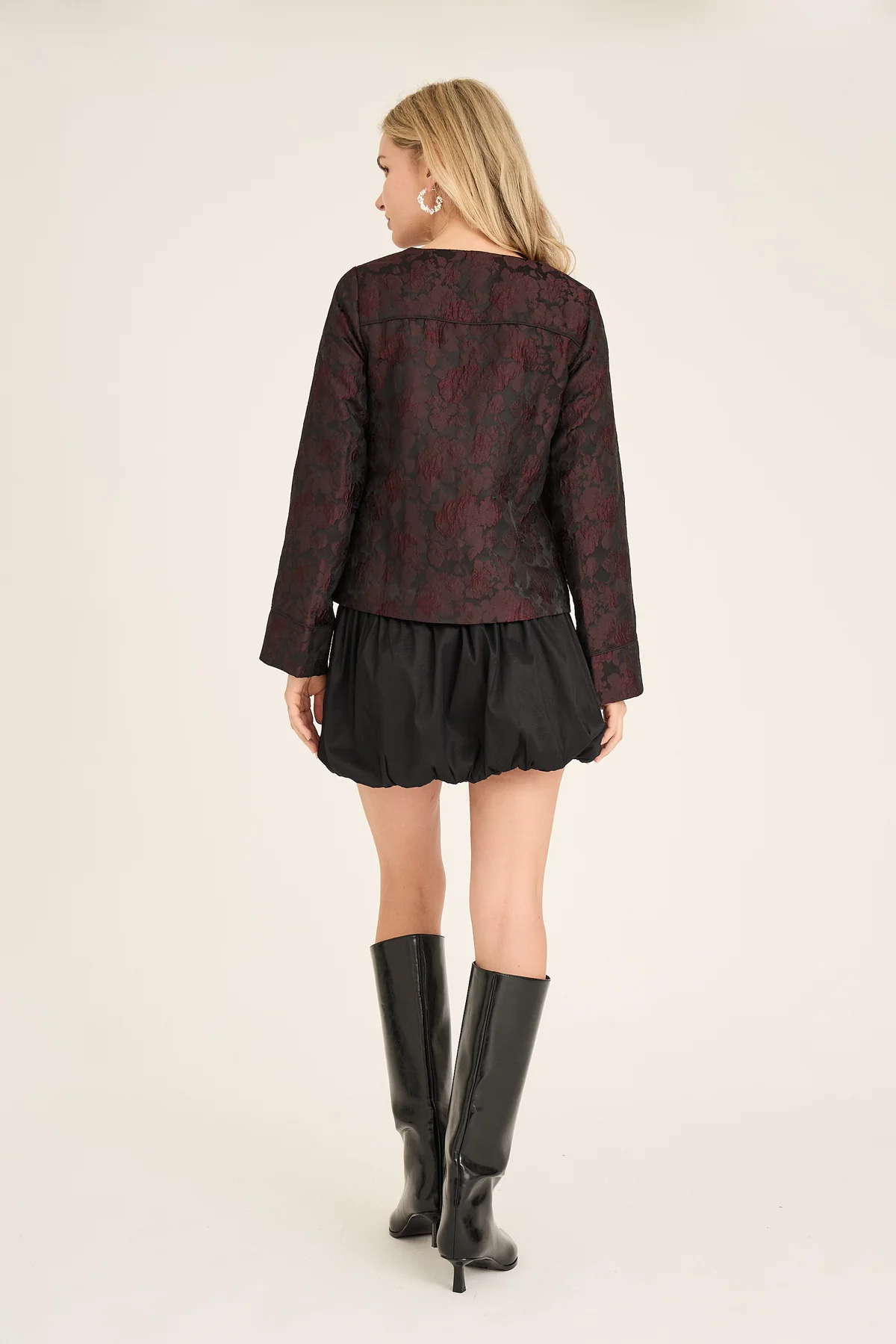 Aria Jacket er en elegant jakke i jacquardvævet materiale med et feminint og struktureret udtryk. Den har rund hals, lange ærmer og lukkes foran med to fine sløjfedetaljer, der tilfører et raffineret touch.
