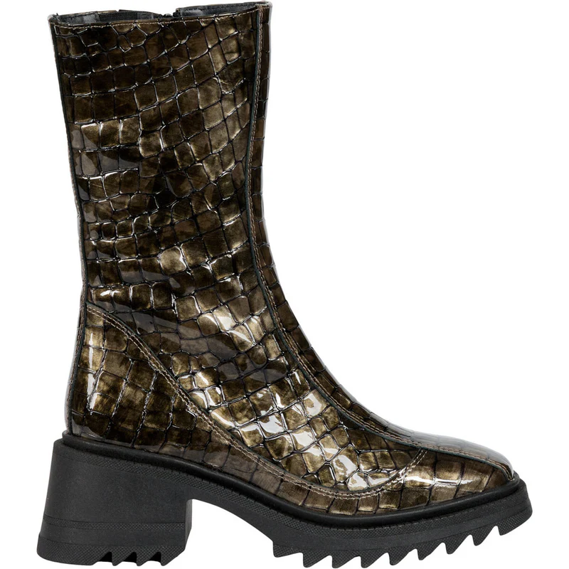 Læder- og lakstøvle fra Tim & Simonsen med lynlås og gummisål. Kombinationen af klassisk skind og blank patentfinish giver et stilfuldt og moderne look, mens den robuste sål sikrer komfort og godt greb i hverdagen.
