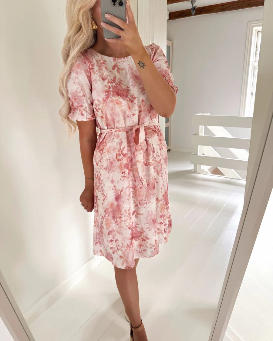 Blomsterkjole fra Sisters Point i bløde rosa pastelfarver med rund hals og pufærmer. Kjolen har en indsyet underkjole, så den ikke er gennemsigtig, og det lette, romantiske design gør den perfekt til både hverdag og særlige lejligheder.