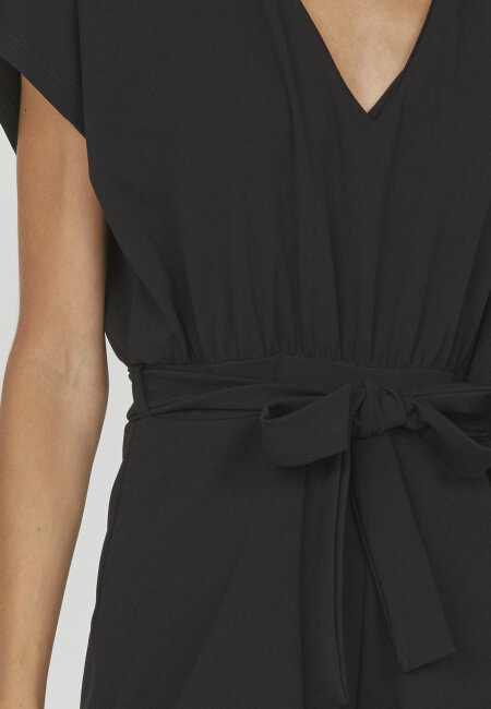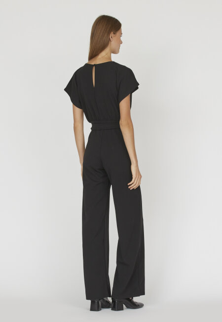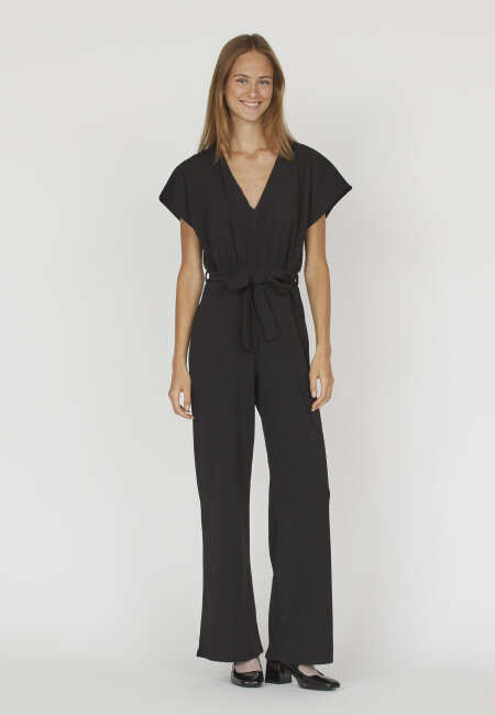 Sisters Point Girl Jumpsuit Black er en super flot, ensfarvet buksedragt med brede ben og en elegant pasform. Den har luftige korte ærmer og en feminin v-hals, der giver et let og stilrent look. Bagpå har buksedragten en åben slids, som tilfører et fint og feminint touch, og i taljen sidder et aftageligt bælte, der fremhæver figuren og giver mulighed for at style den, som du ønsker.