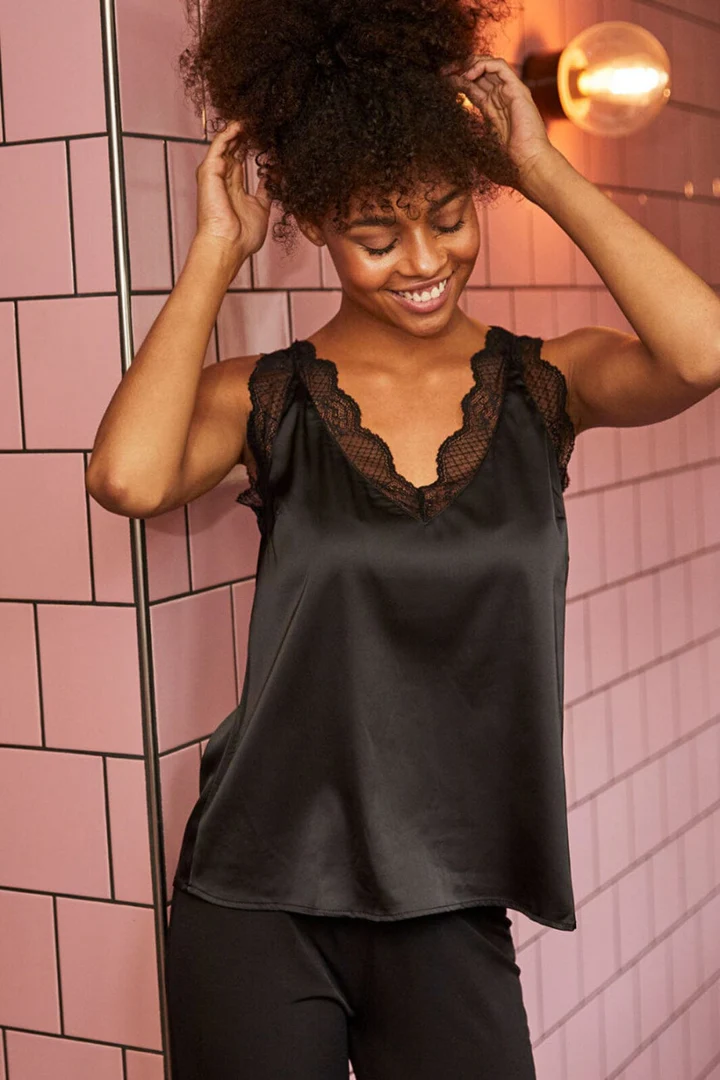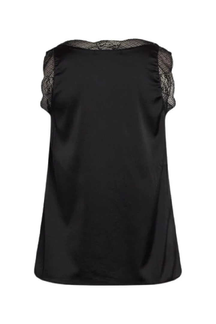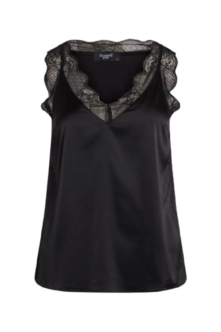 Sisters Point Vara Top Black er en elegant, ensfarvet satintop i en let og løstsiddende pasform, der falder flot på kroppen. Toppen har en feminin v-hals med fine blondedetaljer, som giver et stilfuldt og romantisk udtryk. Den bløde satin tilfører et eksklusivt look, der gør toppen oplagt til både hverdagsbrug og festlige anledninger