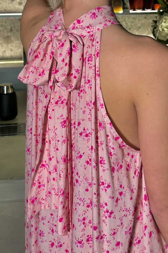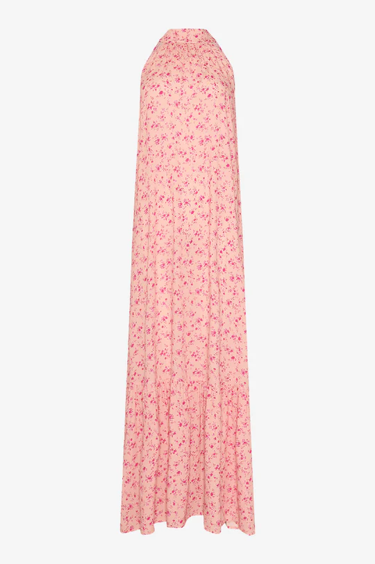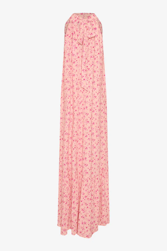Noella London Maxi Dress Cheryl Pink Print er en elegant maxikjole med et let og luftigt udtryk. Den har en høj hals og bindes smukt med en sløjfe i ryggen, hvilket giver et feminint og sofistikeret look – perfekt til både særlige anledninger og lange sommerdage.