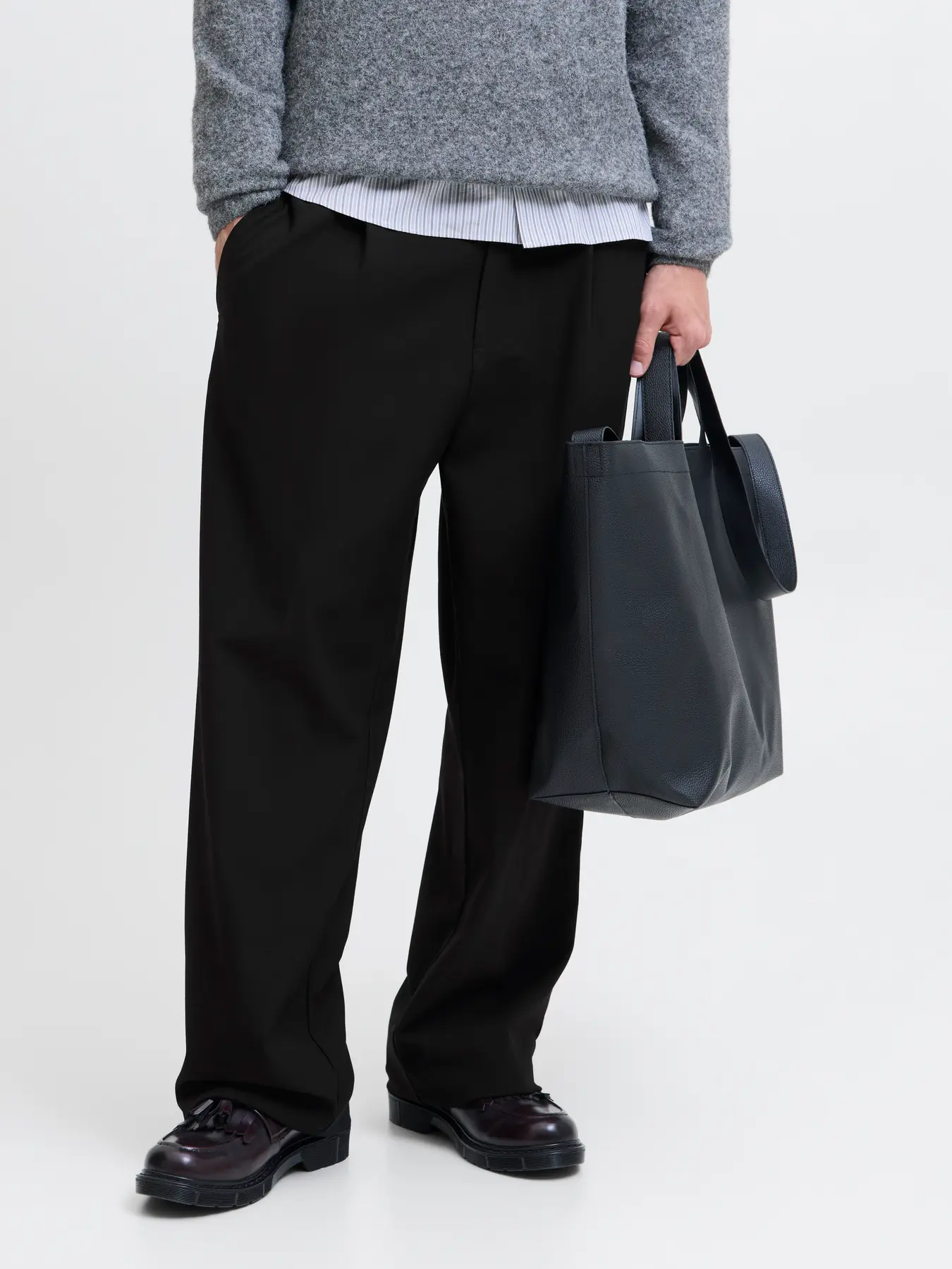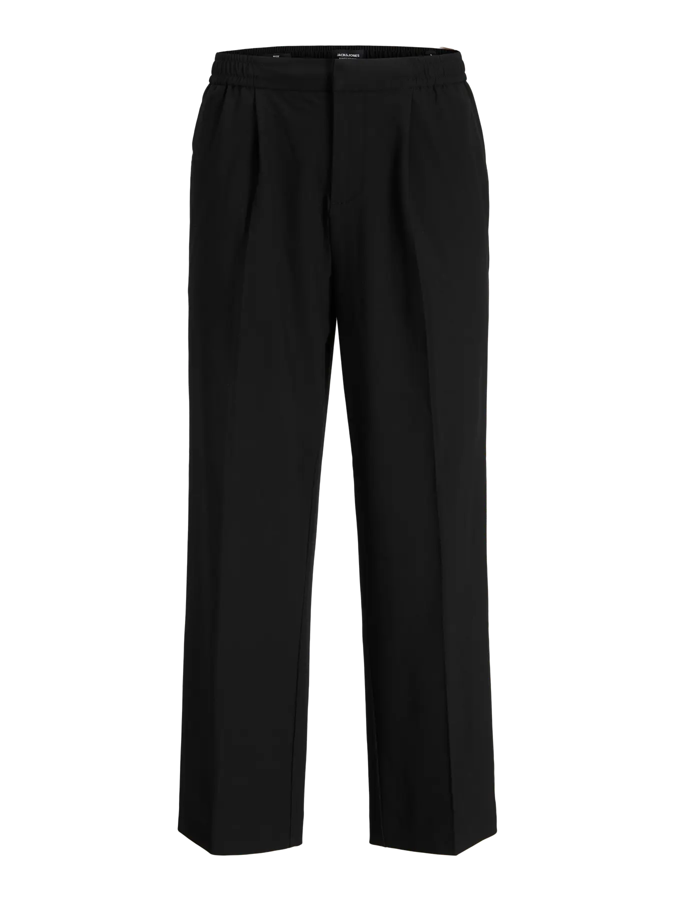 Jack & Jones Bill Diego Jogger Black er et stilrent valg til festlige anledninger, hvor du vil være velklædt. Bukserne er lavet i en slidstærk vævet kvalitet, der holder formen. De har høj talje og en moderne wide fit med god vidde i benene, som giver et afslappet og elegant look, samt lynlåslukning i gylpen.
