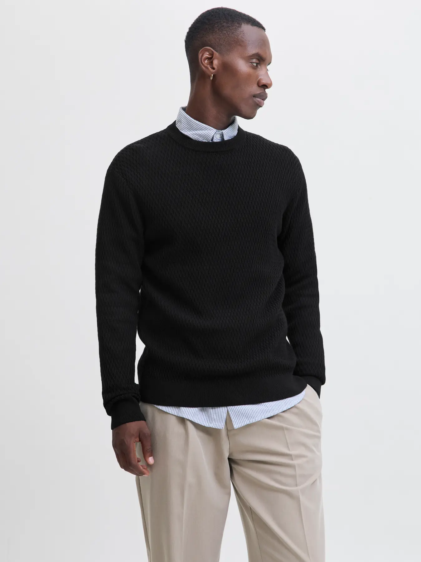 Jack & Jones Regan Knit Crew Neck Black er en stilfuld striktrøje i blød kvalitet med et diskret mønster i selve strikken, der giver ekstra tekstur og dybde. Den har klassisk rund hals og ribkanter ved ærmer og bund, som sikrer en behagelig og tætsiddende pasform. Perfekt til både hverdagsbrug og mere afslappede, pænere outfits.