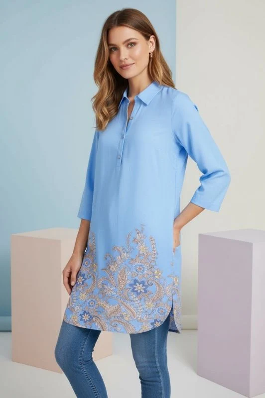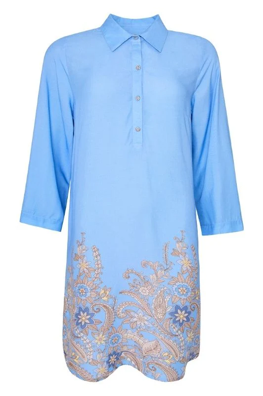 Cassiopeia Janilla Tunic Blue Combi er en let og feminin tunika med et stilrent udtryk. Den er designet med klassisk skjortekrave, knaplukning og 3/4-lange ærmer, som giver et afslappet look. Længden går over knæet, så den både kan bruges som tunika eller som en let kjole, mens det blå mønster tilfører et friskt og moderne præg.