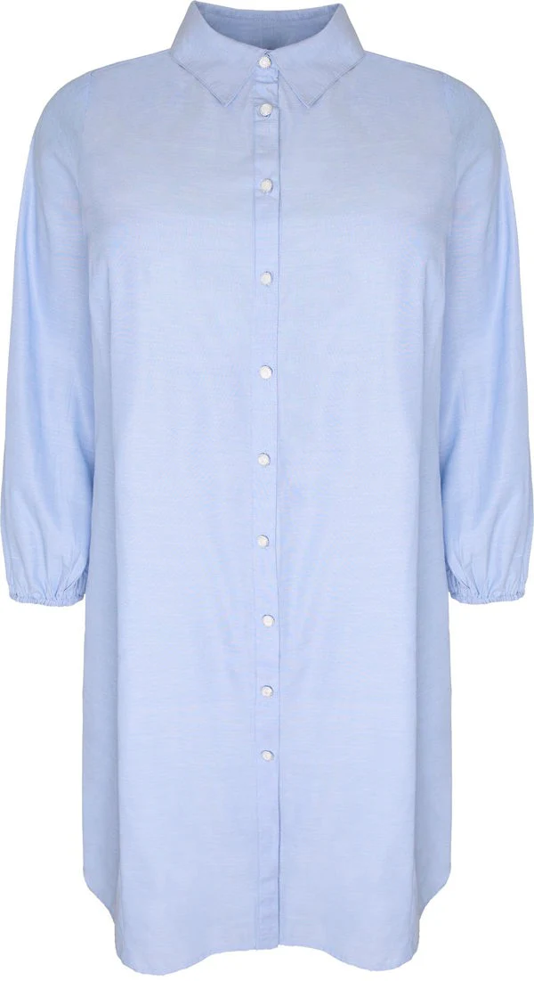 Cassiopeia Almedina Dress Light Blue er en enkel og elegant kjole i en smuk lyseblå nuance. Den er designet med klassisk skjortekrave, gennemgående knaplukning og 3/4-lange ærmer med let elastik, som giver et afslappet og feminint udtryk. Den løse pasform gør den behagelig at have på og nem at style til både hverdag og mere afslappede anledninger.
