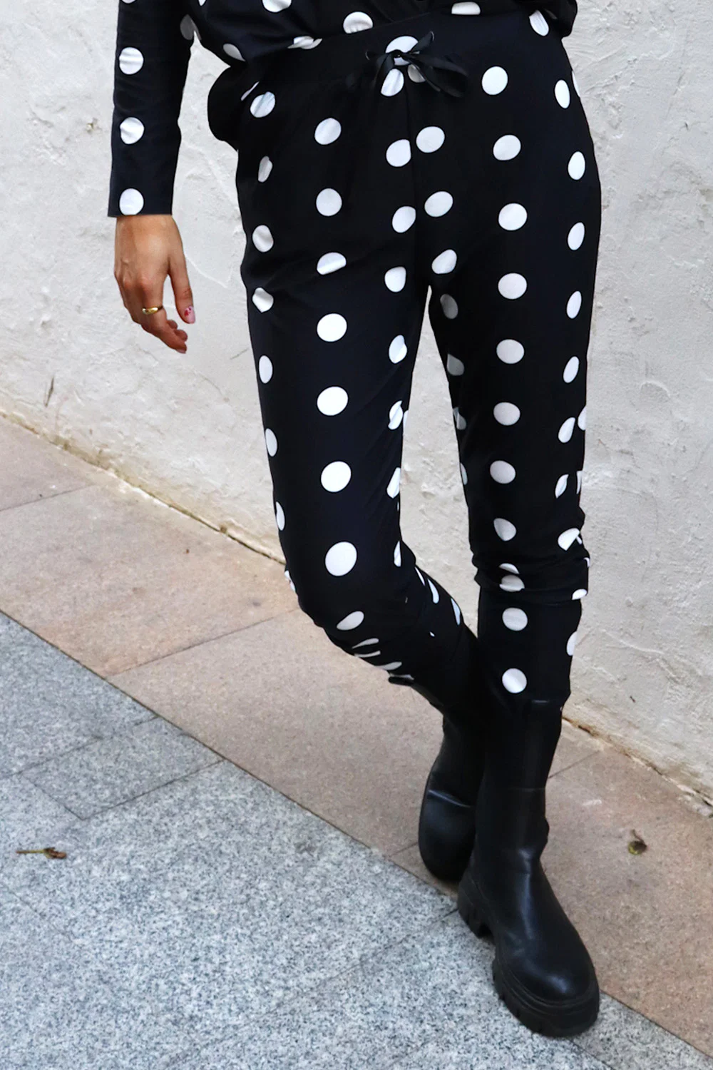 Liberte Essentiel Alma Pants Black Big Dot er lette og behagelige bukser med en løs pasform og elastisk talje, der giver et afslappet og moderne udtryk. Det sorte design med store prikker skaber et iøjnefaldende look, og de kan styles med den matchende top for et cool og gennemført sæt.